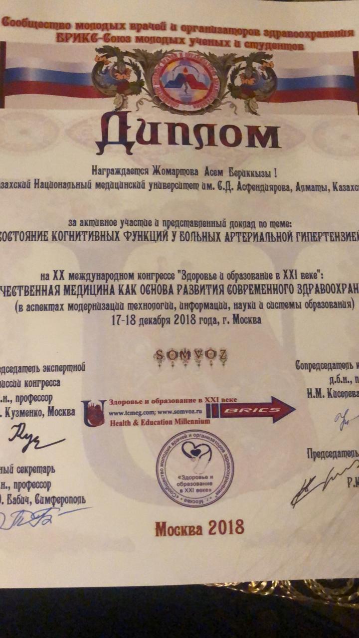 в мероприятии под руководством заведующей кафедры нервные болезни с курсом нейрохирургии Туруспековой С.Т., приняли активное участие ассистент кафедры Демесинова Б.К и студенты 5 курса факультета общей медицины Ахмет М.С. и Жомартова А.Б. Ассистент Демесинова Б.К выступила с научным докладом на тему: «Первые результаты скрининга умеренных когнитивных нарушений среди лиц страше 60 лет в казахской популяции», а темой доклада наших студентов была: «Состояние когнитивных функций у больных артериальной гипертензией».